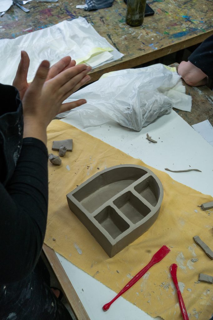 Neben der Drehscheibe wurde auch fleißig modelliert. Mit der Plattentechnik und Daumenschalen verwandelten sich Tonstücke in kreative Einzelwerke. Der Fantasie waren keine Grenzen gesetzt, nur die Hände wurden irgendwann müde.