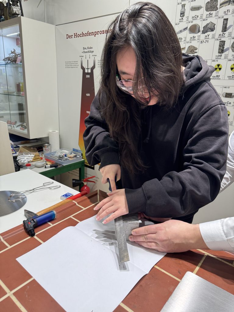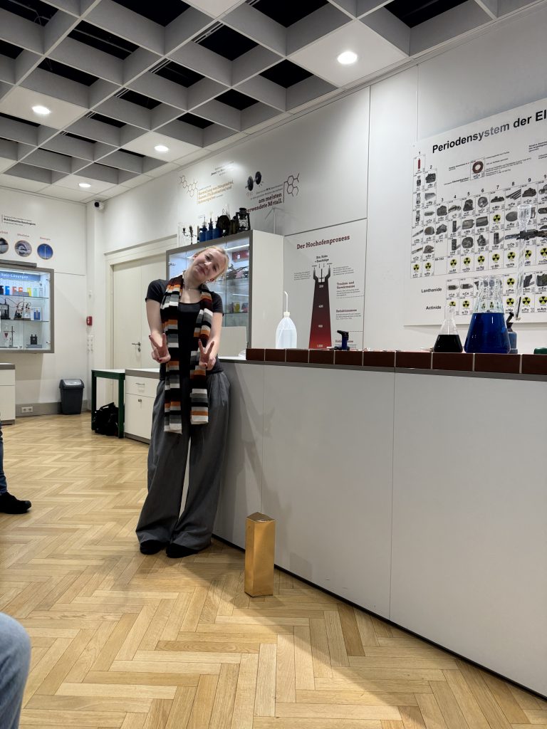 Nach einer Mittagspause gab es dann in der Ausstellung “Die Schönheit der Elemente” einen weiteren Experimentalvortrag mit Informationen zu Berufsbildern in der Chemie und unterschiedlichen Elementen des PSE. Ein informationsreicher und spannender Tag ganz im Zeichen der Chemie.